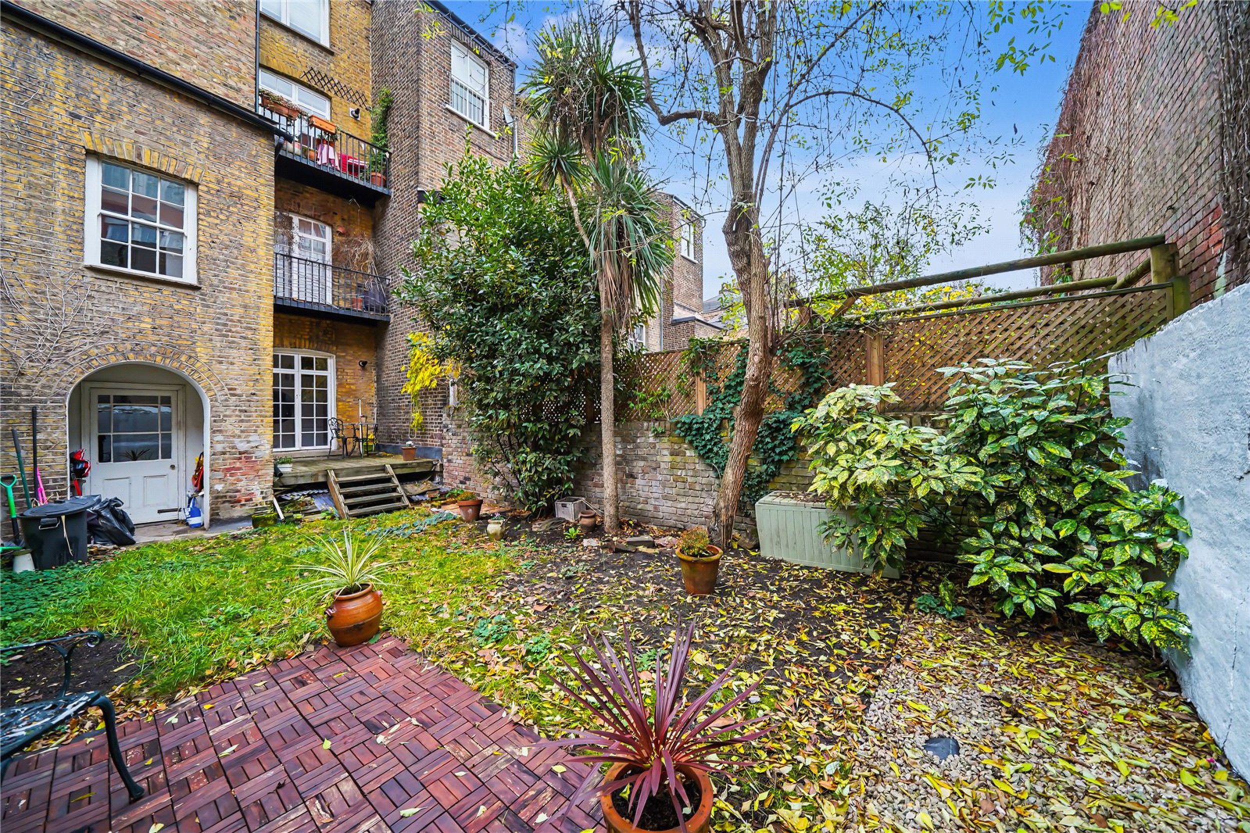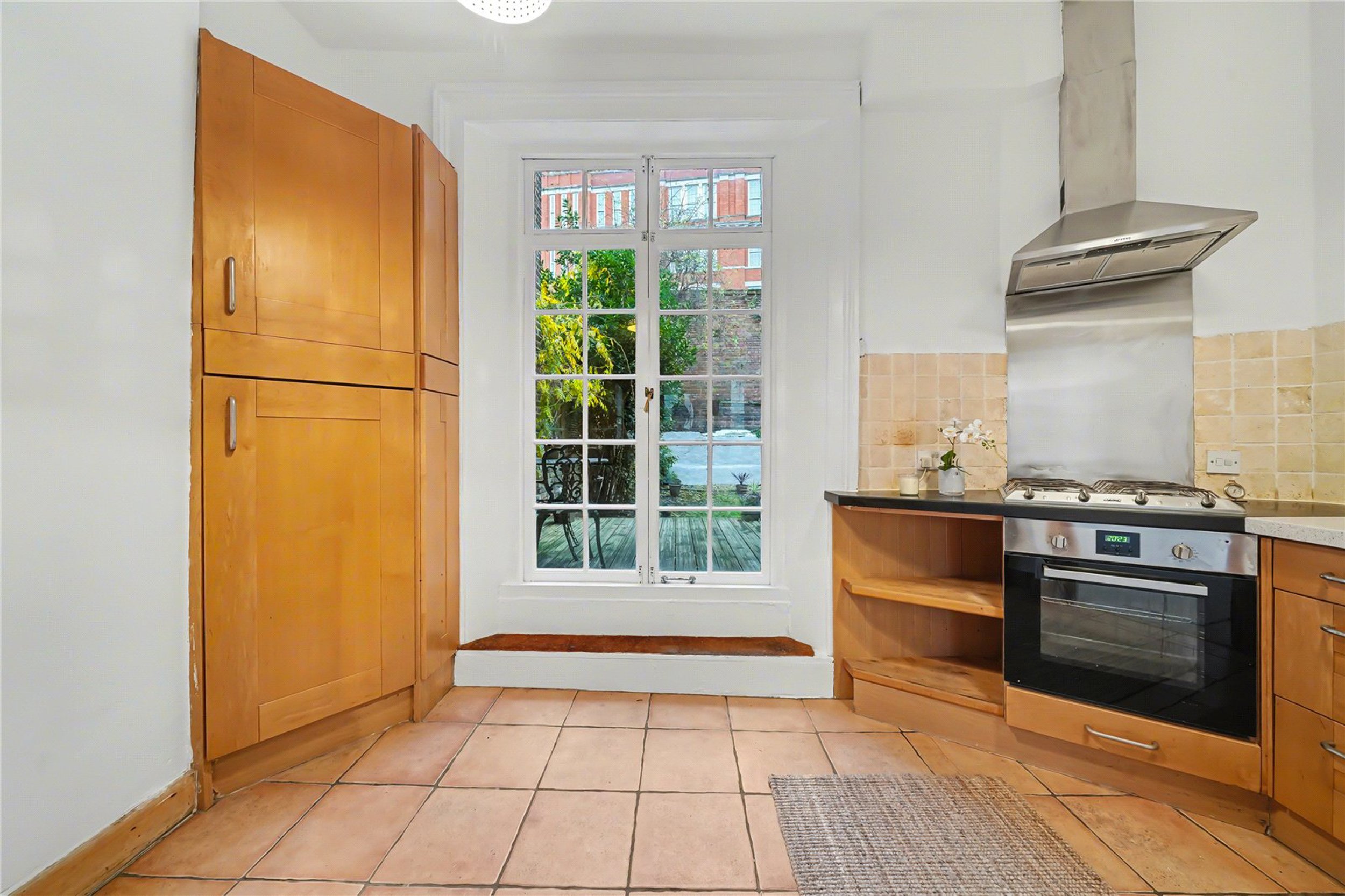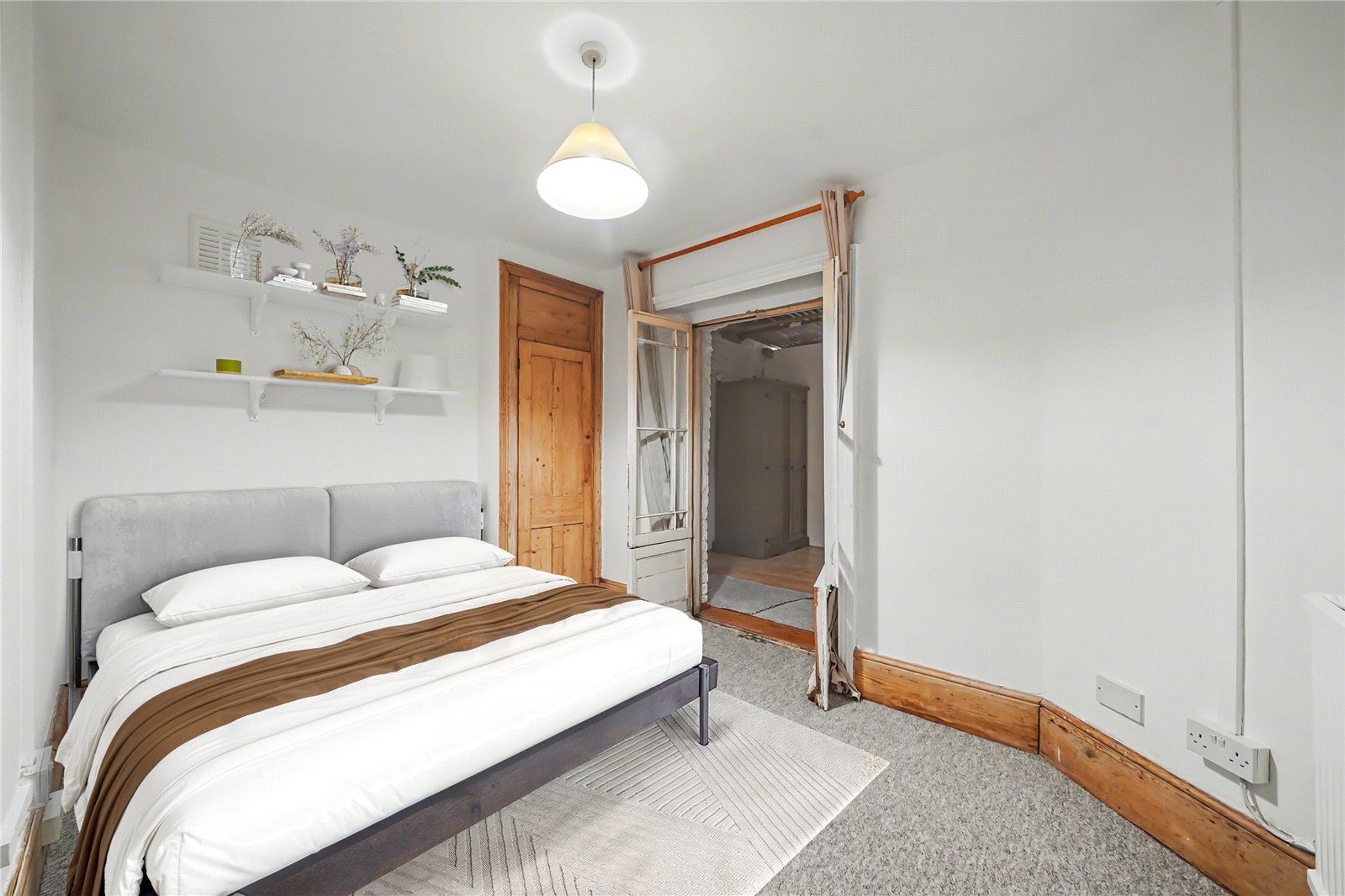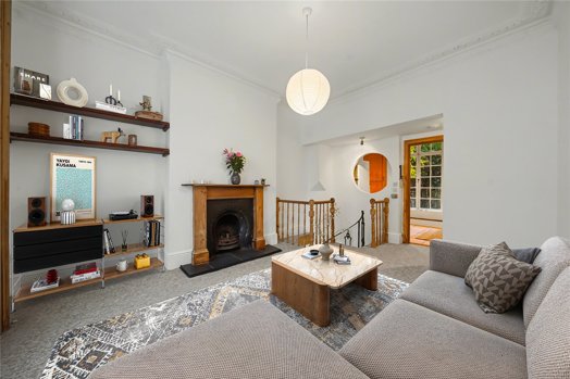 To the front of the raised ground floor is a splendid reception room featuring high ceilings, original coving, an ornate fireplace with a period surround, and large sash windows complete with original shutters. To the rear, the spacious kitchen-diner provides direct access to a charming private walled garden—ideal for entertaining or relaxing. The lower ground floor comprises a large bathroom with a freestanding tub and two double bedrooms, including a principal bedroom that enjoys the added luxury of a walk-in shower.