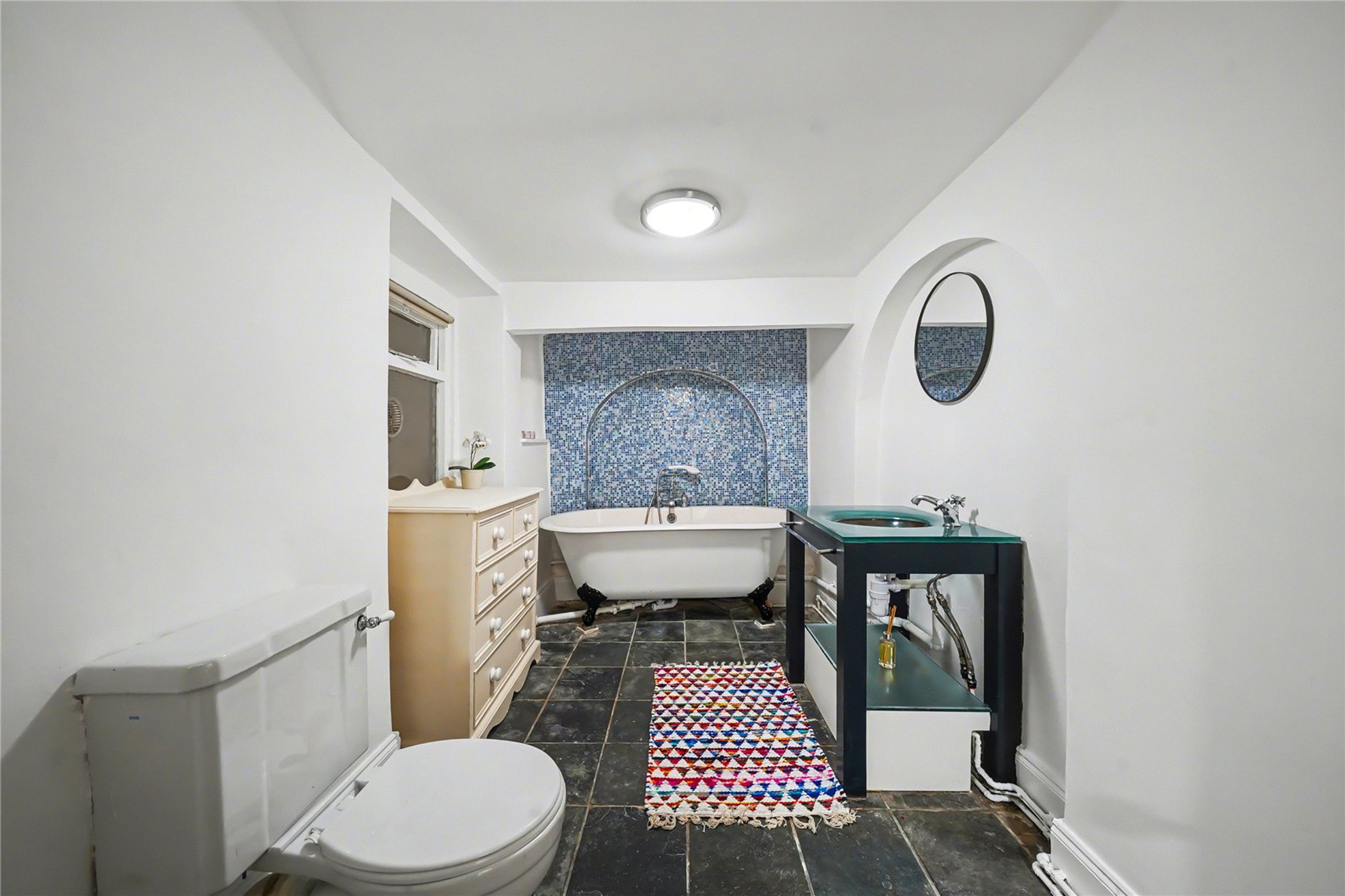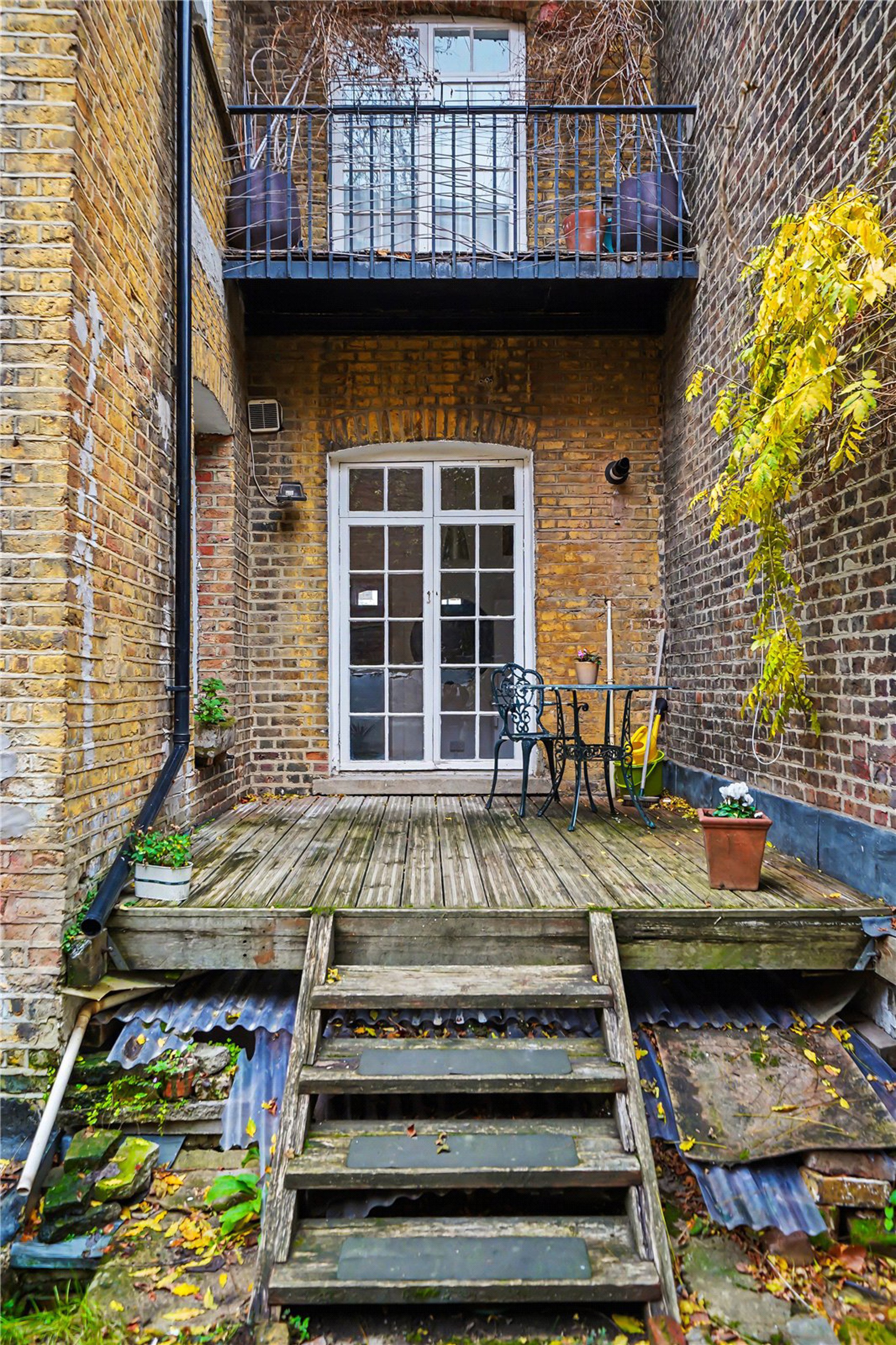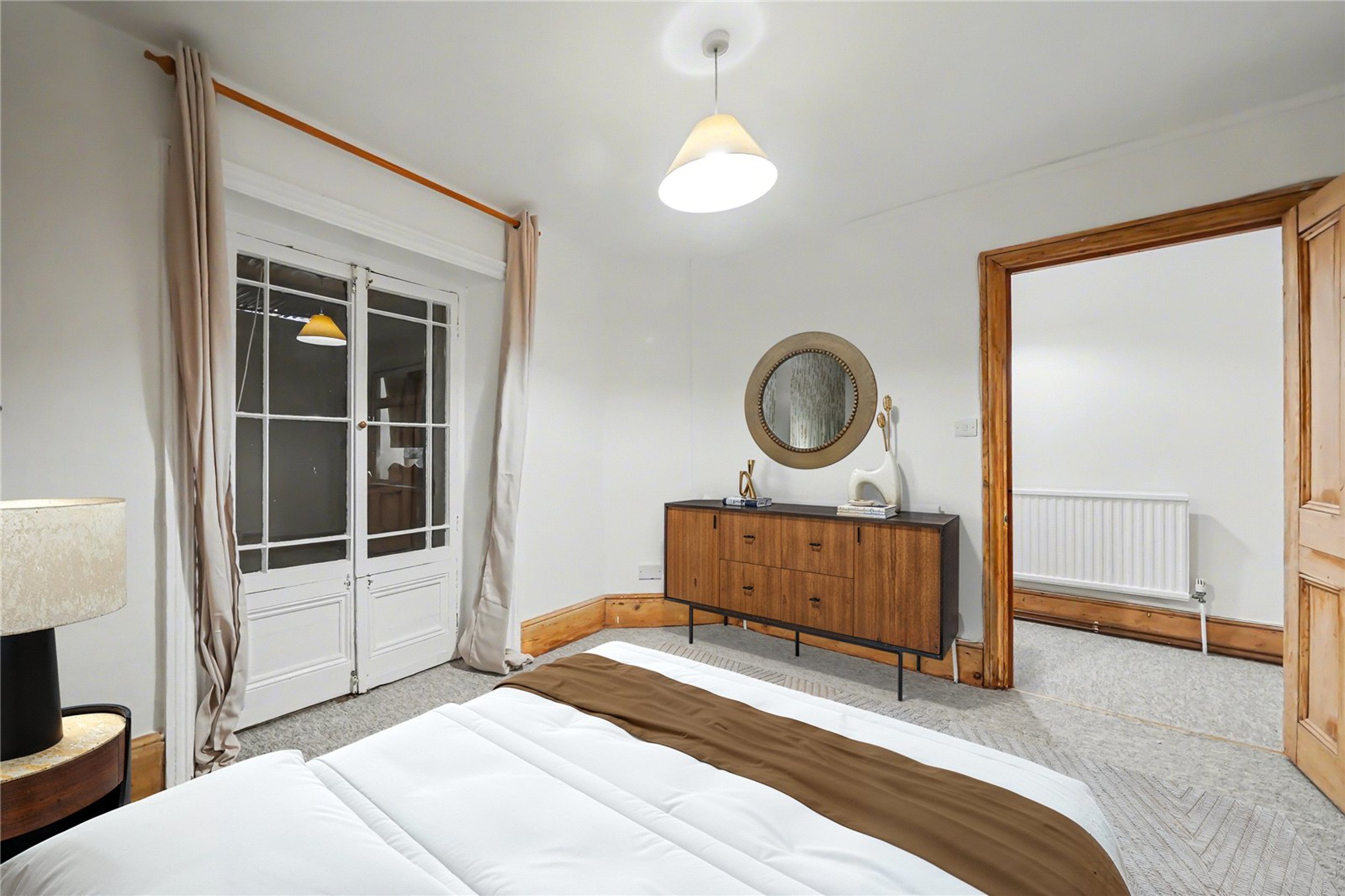 To the front of the raised ground floor is a splendid reception room featuring high ceilings, original coving, an ornate fireplace with a period surround, and large sash windows complete with original shutters. To the rear, the spacious kitchen-diner provides direct access to a charming private walled garden—ideal for entertaining or relaxing. The lower ground floor comprises a large bathroom with a freestanding tub and two double bedrooms, including a principal bedroom that enjoys the added luxury of a walk-in shower.