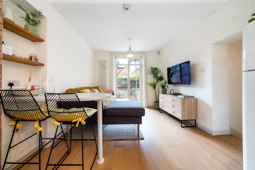 Accommodation comprises entrance hall with access to guest WC and deep inbuilt storage providing additional space for washer/dryer, leading to the dual aspect second bedroom with inbuilt wardrobe, full height front aspect sash window and further shuttered sash window with views over the communal garden. From the hallway, there is also access to the luxury shower/WC, elegantly tiled, with generous walk-in shower with rainwater shower head, ceramic sink and WC. A further doorway leads into the bright dining area with feature windows with wrought iron railings, and double doors into the master bedroom (currently laid out as the lounge). This beautiful room enjoys two shuttered sash windows (one full height) as well as a stunning cast iron fireplace with white marble surround. From the dining area, steps lead up to the kitchen/diner with exposed brick chimney breast and original wood burning stove. The kitchen area comprises a bespoke range of 'Harvey Jones' wall and base units with marble work surfaces and breakfast bar area incorporating under-counter 'Belfast' sink, electric hob and oven, and integrated dishwasher.