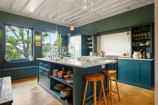 The grand hallway leads to a wonderfully vast, dual aspect open plan kitchen / dining / reception room. Originally two generous rooms, the vendor has created a truly magnificent entertaining space, which really is the heart of the home that beholds an array of splendid features including vaulted ceilings with wooden beams, parquet flooring, cast iron radiators, a wood burning stove with stone surround and a ‘deVOL’ kitchen and separate island that is finished with sage green units, butlers sink with brass fittings and complemented with marble worktops. The kitchen island also doubles up as a beautiful breakfast bar and there is ample worksurface and storage space. This wonderful rooms enjoys an East / West orientation so perfect for watching the sunrise over Highbury Field and the sun setting towards the rear.