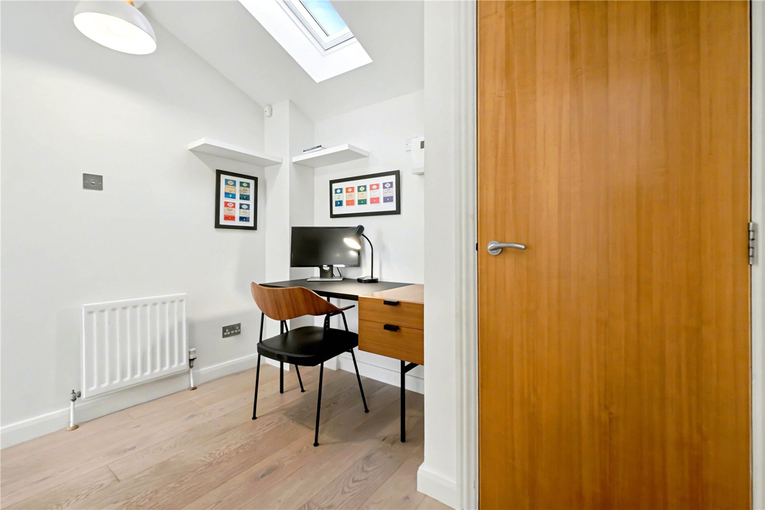 Across the first floor is a bright double bedroom with fully fitted wardrobes and dressing table and newly fitted shutters. Also on this level, a modern bathroom with skylight and smart dedicated working area on the landing. Outside, to the front is a separate storage cupboard and a dedicated parking space for sole use of the property right beside the front door.