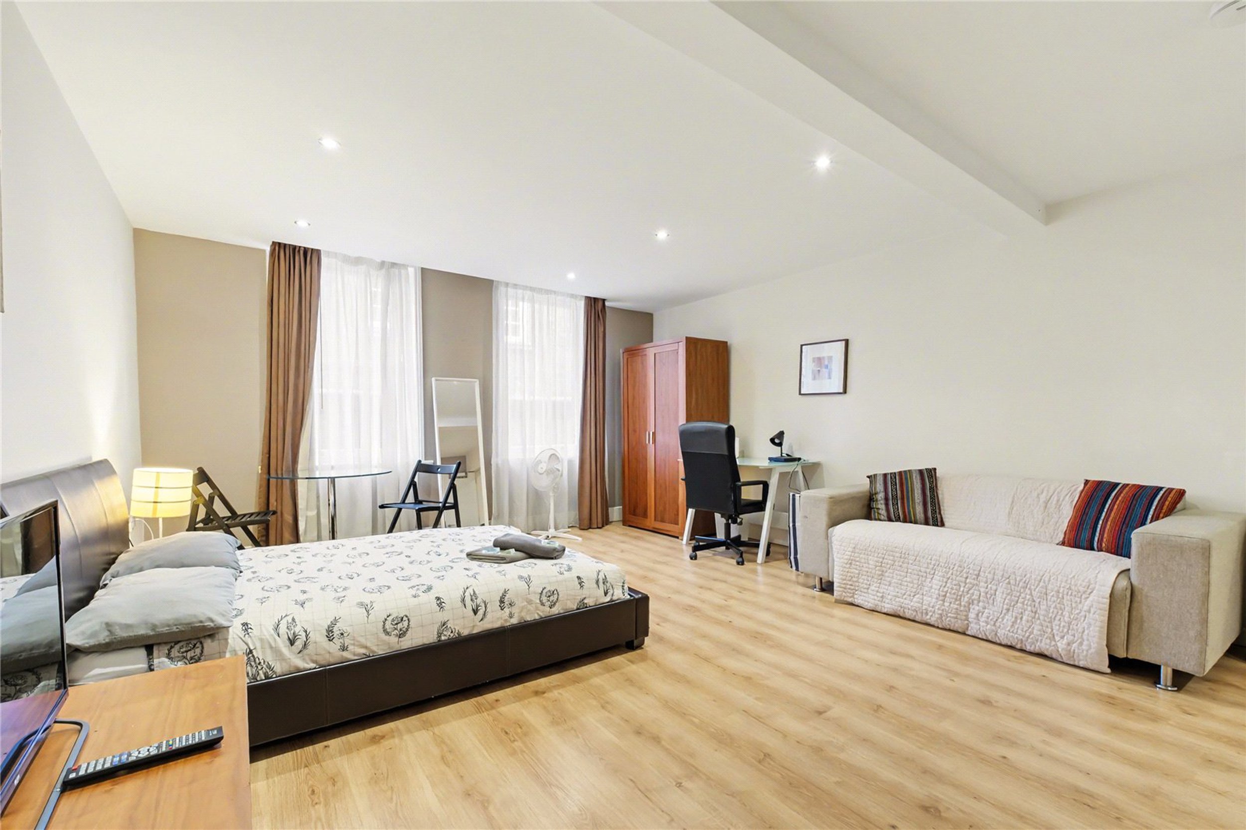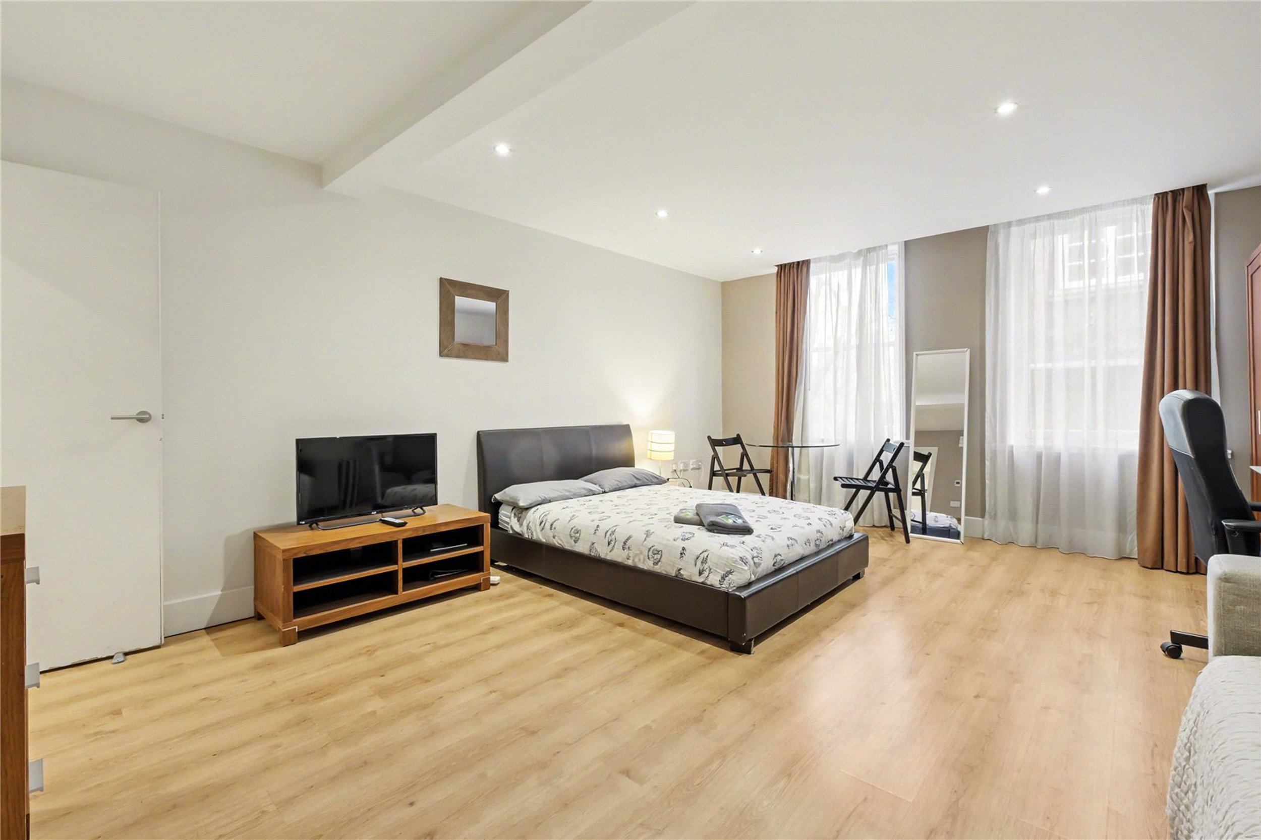 The size of the studio allows for a distinct separation between lounge and dining areas. Thoughtfully designed to maximize space and natural light, this is a bright, open-plan space with wood flooring and two large sash windows. The recessed kitchen is fitted with integrated appliances, and sleek cabinetry.