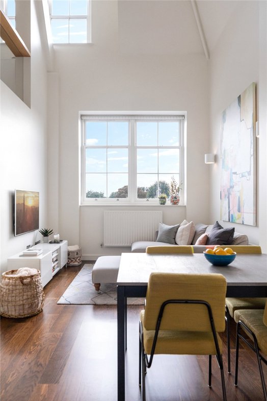 The reception room showcases characterful period features from its Victorian schoolhouse origins and provides an ideal space for entertaining and hosting. Also on this floor is a large storage cupboard, WC, and the second double bedroom, which also benefits from abundant natural light through its large south-facing sash windows.