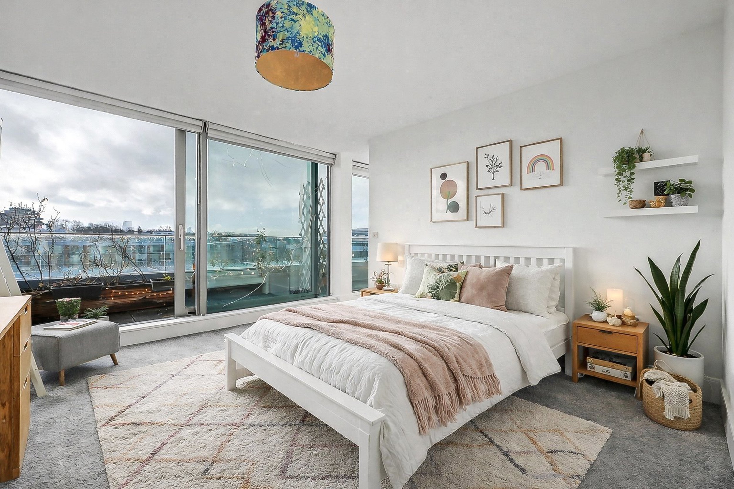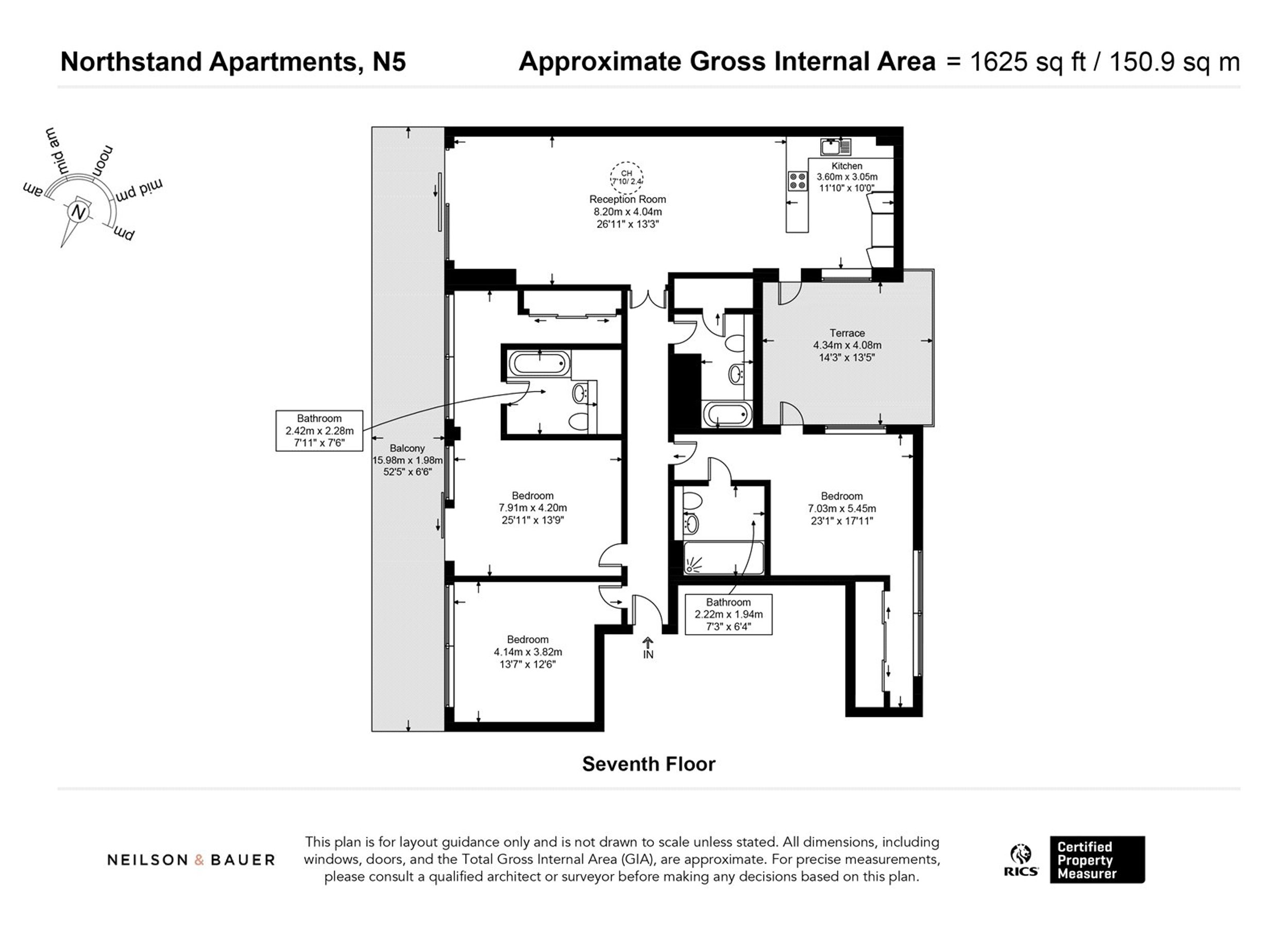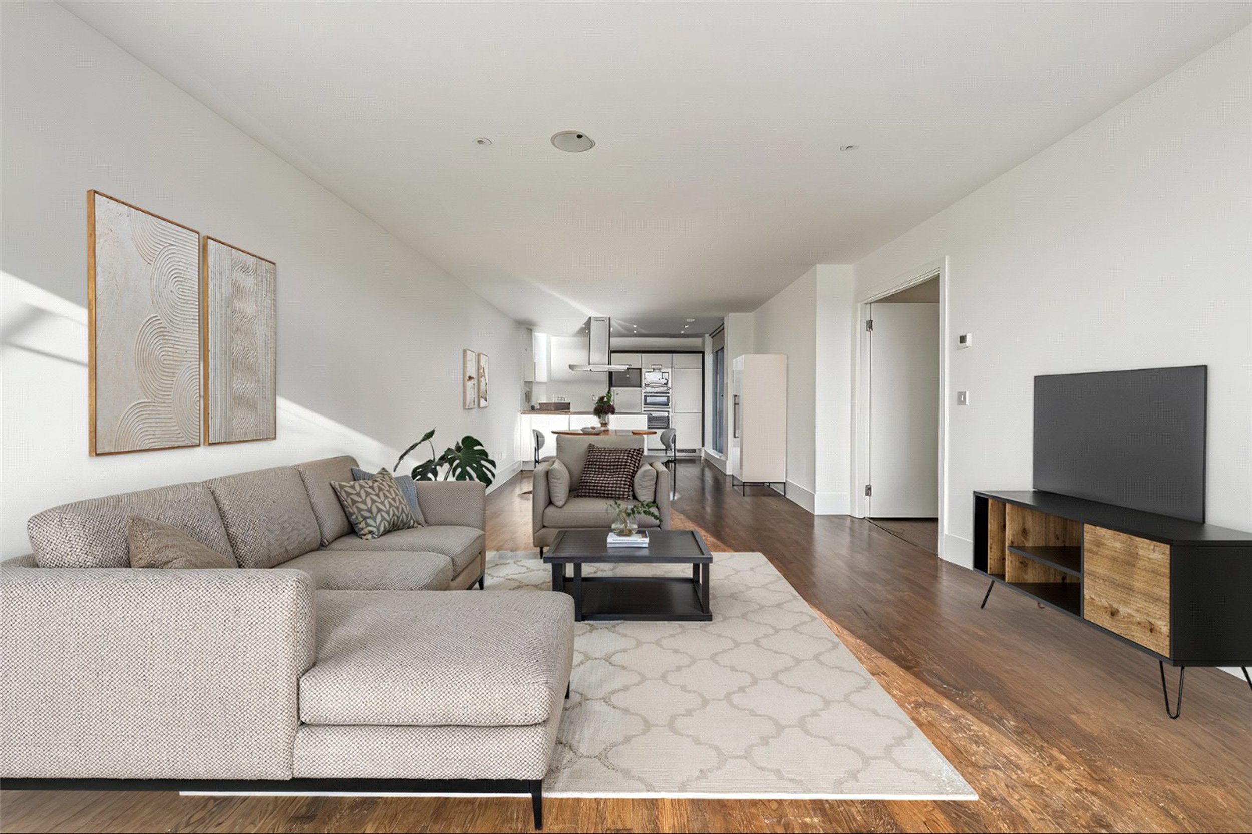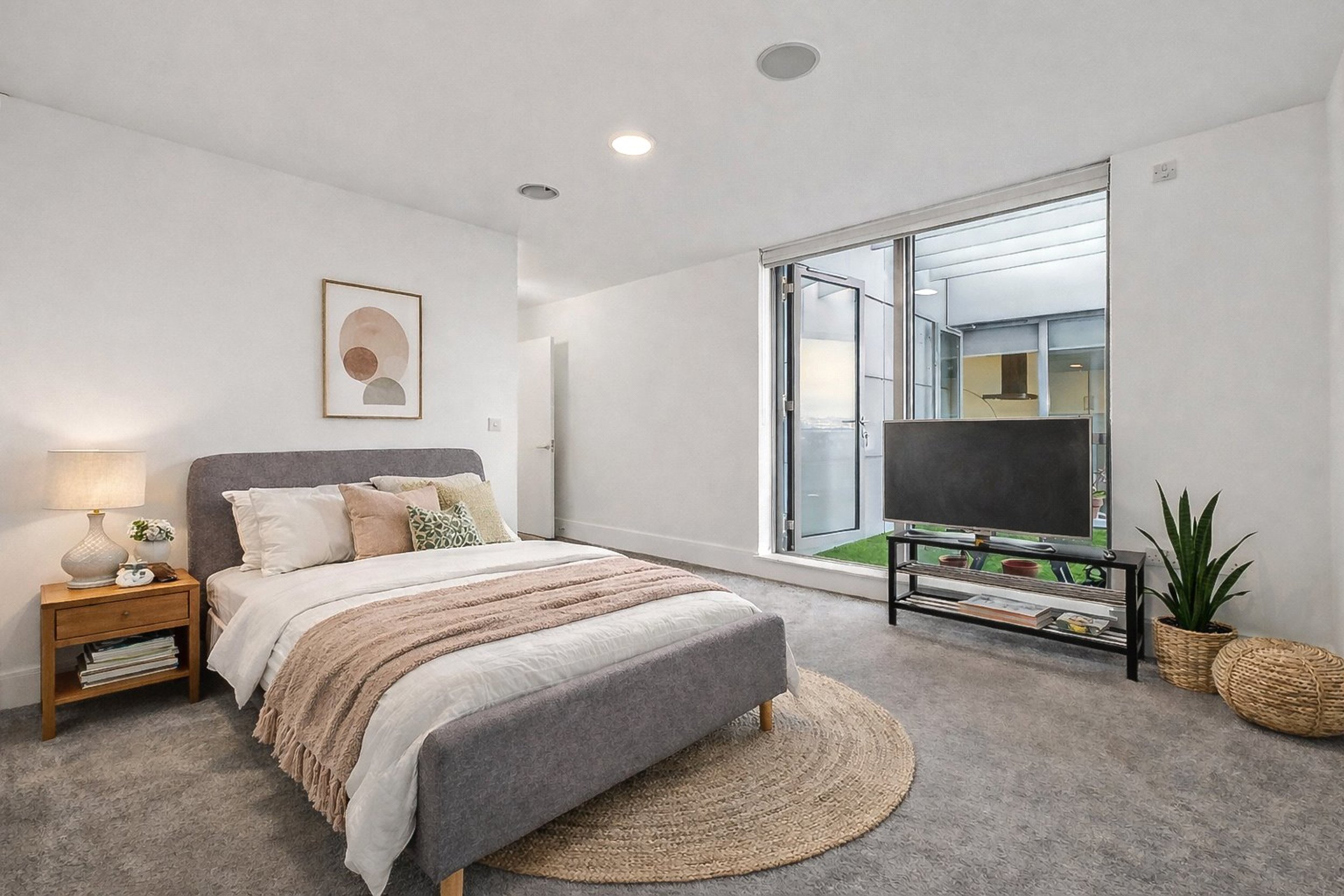 Offering 1,625 sq ft of superb lateral living space with excellent ceiling height throughout, the property comprises an inviting entrance leading into a wide hallway that sets the tone for this bright and airy home, with generous proportions throughout. Off the hallway are three well-proportioned double bedrooms, two of which benefit from en-suite bathrooms and separate dressing areas. Each bedroom enjoys wonderful natural light from floor to ceiling glazed doors, all providing direct access to the terrace.