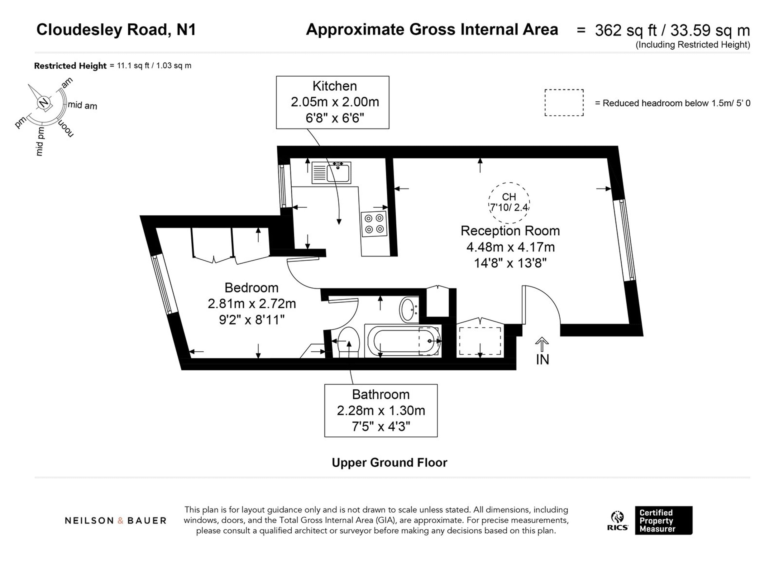 Situated on Cloudesley Road, this well-presented one-bedroom flat is set on the raised ground floor of a late Georgian/early Victorian Grade II listed conversion and offers approximately 362 sq ft of internal accommodation. The property is being sold with a share of the freehold. The accommodation comprises a bright reception room featuring attractive arched sash windows with double-glazed insets, allowing for excellent natural light. To the rear is a modern fitted kitchen, which enjoys afternoon sunlight. The bedroom benefits from having fitted wardrobes and a modern contemporary en-suite bathroom, finished to a good standard. There is also useful storage beneath the stairs, ideal for suitcases, along with an additional storage cupboard off the hallway. Cloudesley Road is a popular tree-lined wide street within the Barnsbury Conservation Area, ideally positioned in the heart of Angel. The amenities of central Islington are easily accessible, including a wide range of shops, restaurants and bars, with Upper Street and Camden Passage both close by. Transport links are excellent, with Angel Underground Station (Northern Line) nearby as is Highbury & Islington Station (providing access to the Victoria Line and London Overground) as well as numerous bus routes. Located a short walk along Regent's Canal is Coal Drops Yard with a wonderful selection of amenities, furthermore King’s Cross/St Pancras (Circle, Hammersmith & City, Metropolitan, Piccadilly, and Victoria Lines, as well as St Pancras International and National Rail) is also within easy reach.
