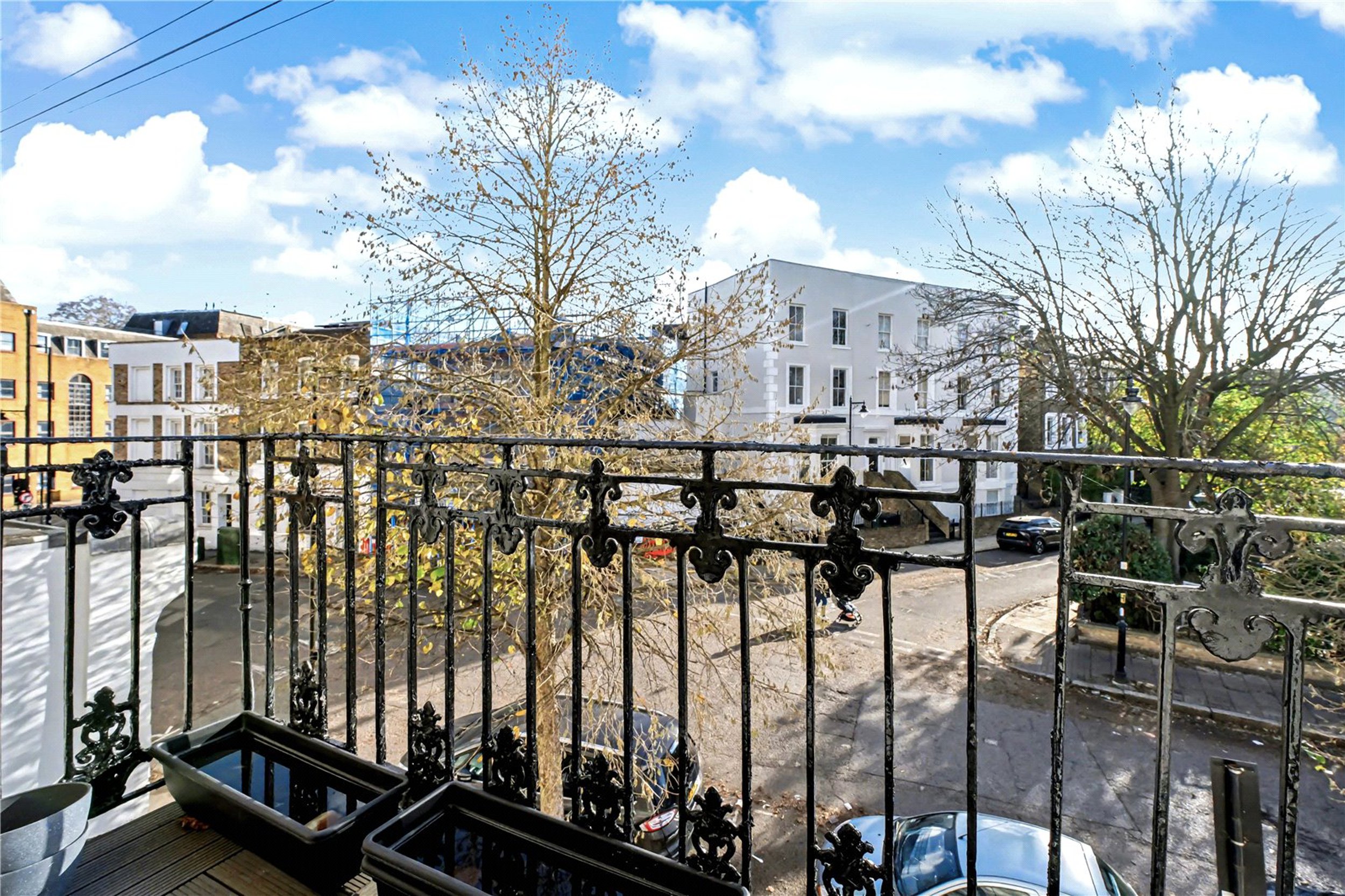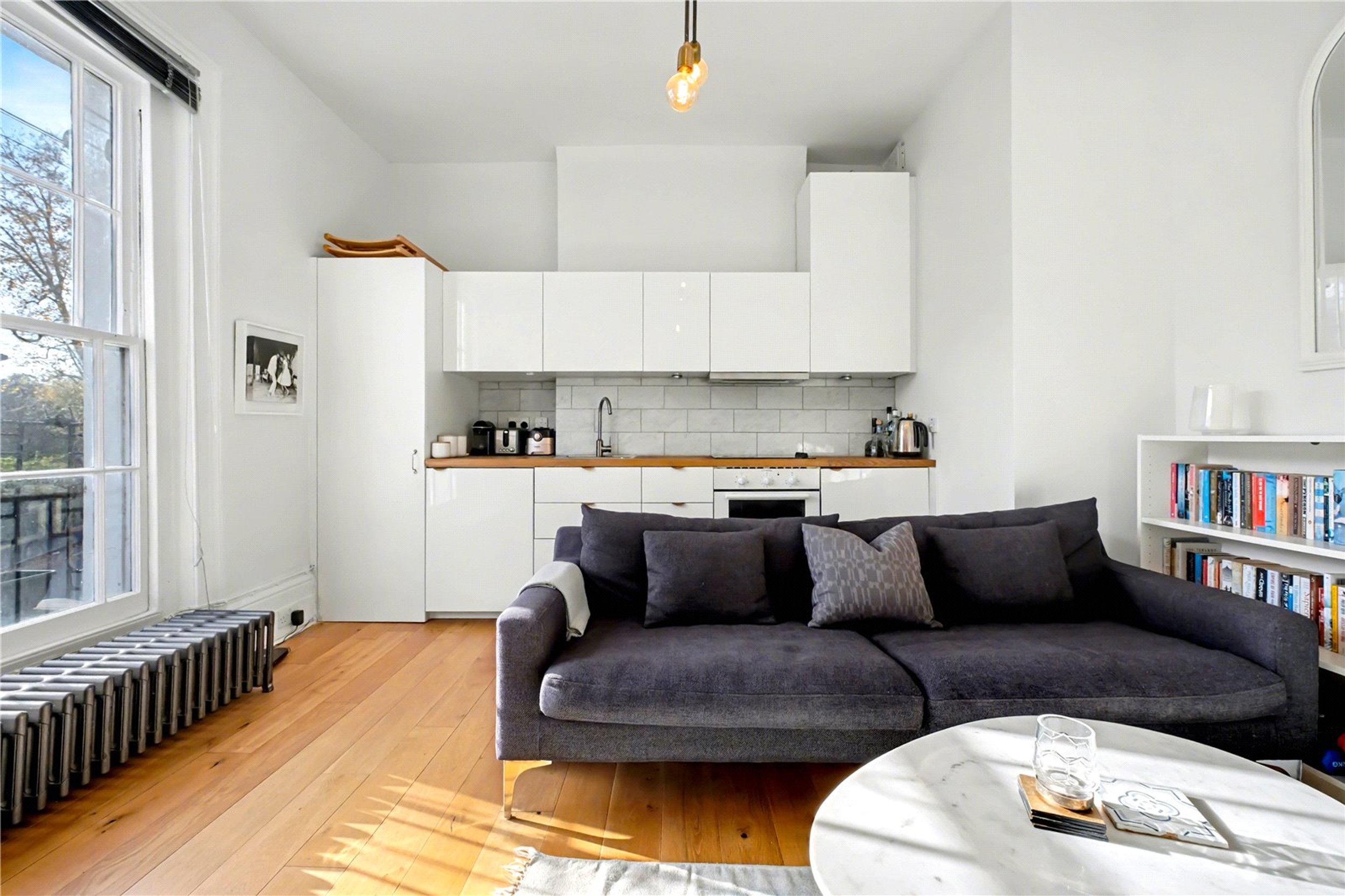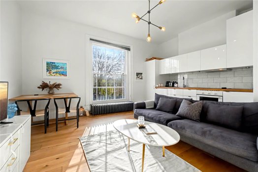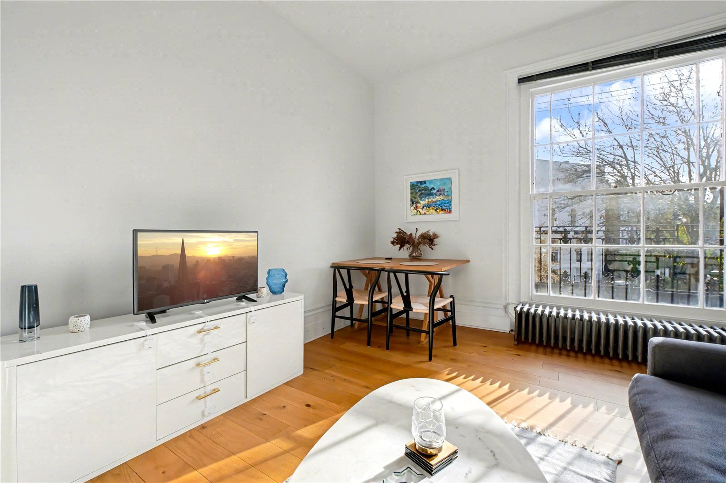 Set on the first floor of a handsome Grade II Georgian terrace is this light and airy one-bedroom flat. Offering generous ceiling height and excellent natural light, the property features a bright, open-plan kitchen/living/dining room to the front. This great entertaining space also boasts wooden flooring, a cast-iron radiator, and a pretty south-facing sash window that opens onto a private balcony with views over a leafy street. The kitchen is fitted with white cabinets, complemented by wooden worktops and tiled splashbacks.