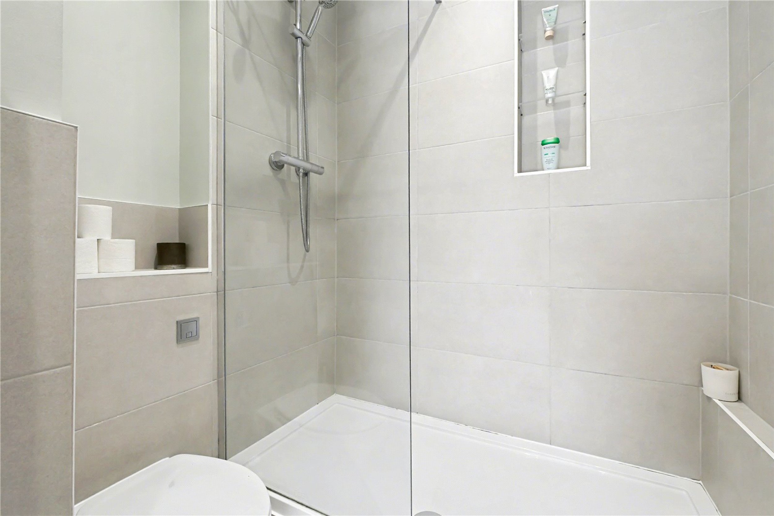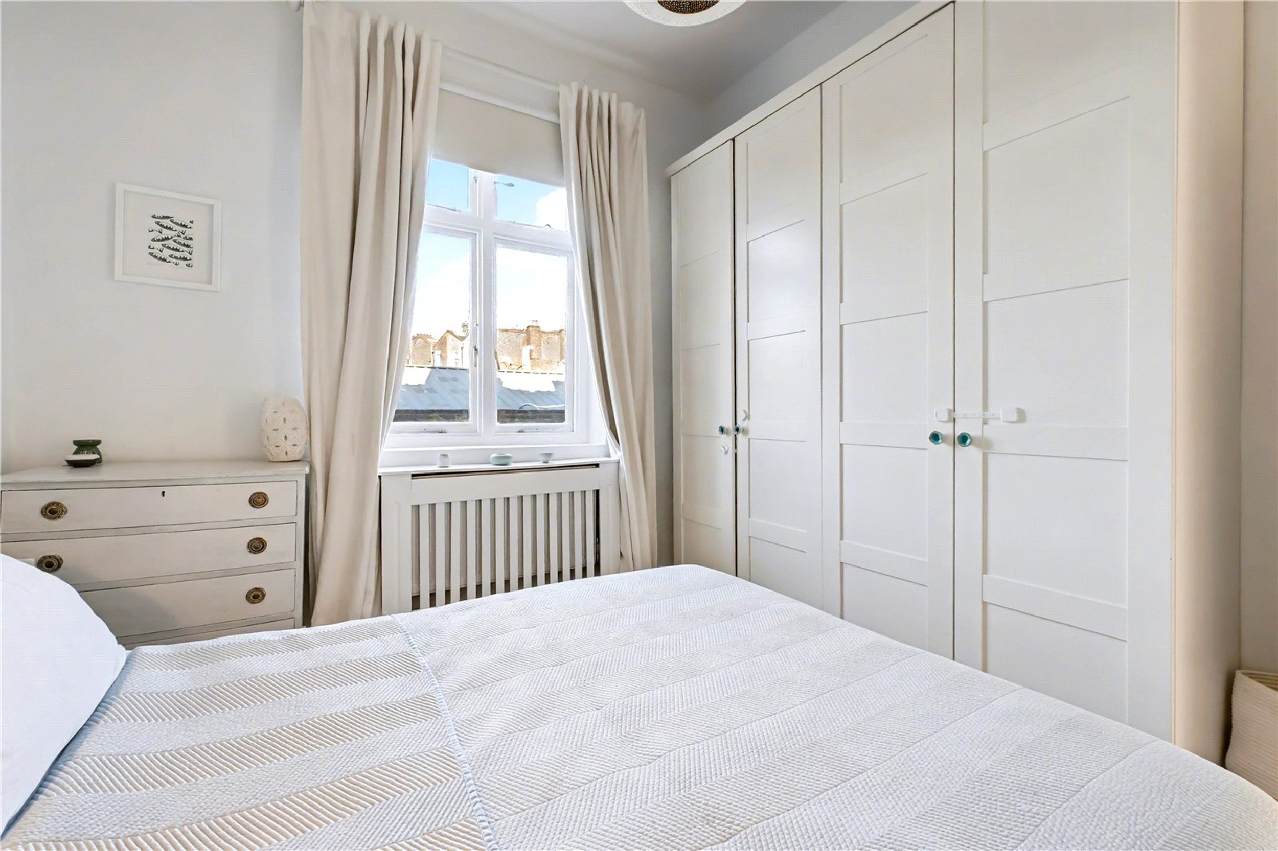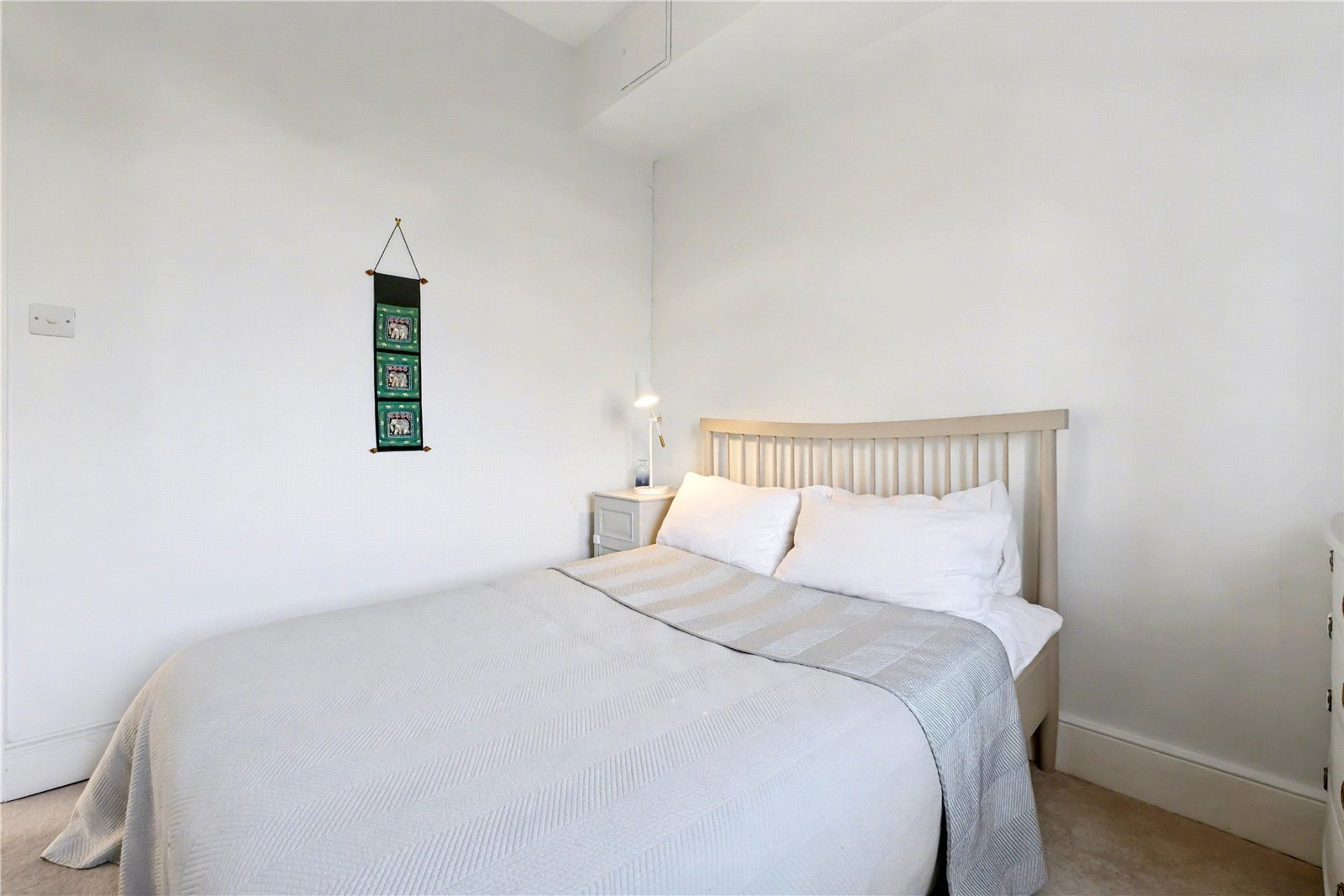 Set on the first floor of a handsome Grade II Georgian terrace is this light and airy one-bedroom flat. Offering generous ceiling height and excellent natural light, the property features a bright, open-plan kitchen/living/dining room to the front. This great entertaining space also boasts wooden flooring, a cast-iron radiator, and a pretty south-facing sash window that opens onto a private balcony with views over a leafy street. The kitchen is fitted with white cabinets, complemented by wooden worktops and tiled splashbacks.