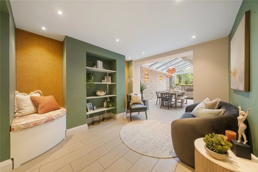 Set across the lower ground floor is the beautiful kitchen/dine, a wonderful space to host. The stylish kitchen is finished with white gloss units, quartz worktops and mirrored splashbacks, plus there is a large central island that also doubles up as breakfast bar and tiled flooring. Leading off the kitchen area is a sunny conservatory that enjoys views over the rear garden. The Westerly facing garden measures approximately 43ft in length and although low maintenance benefits from having a variety of mature trees and shrubs.