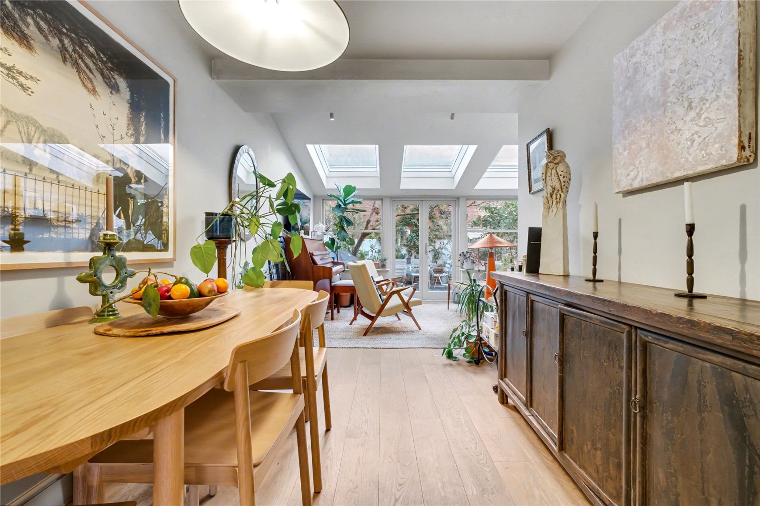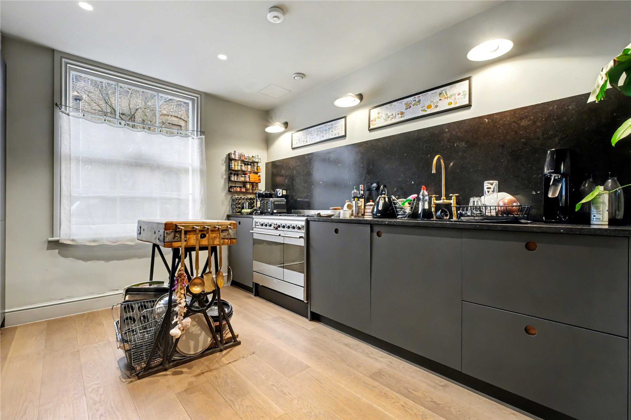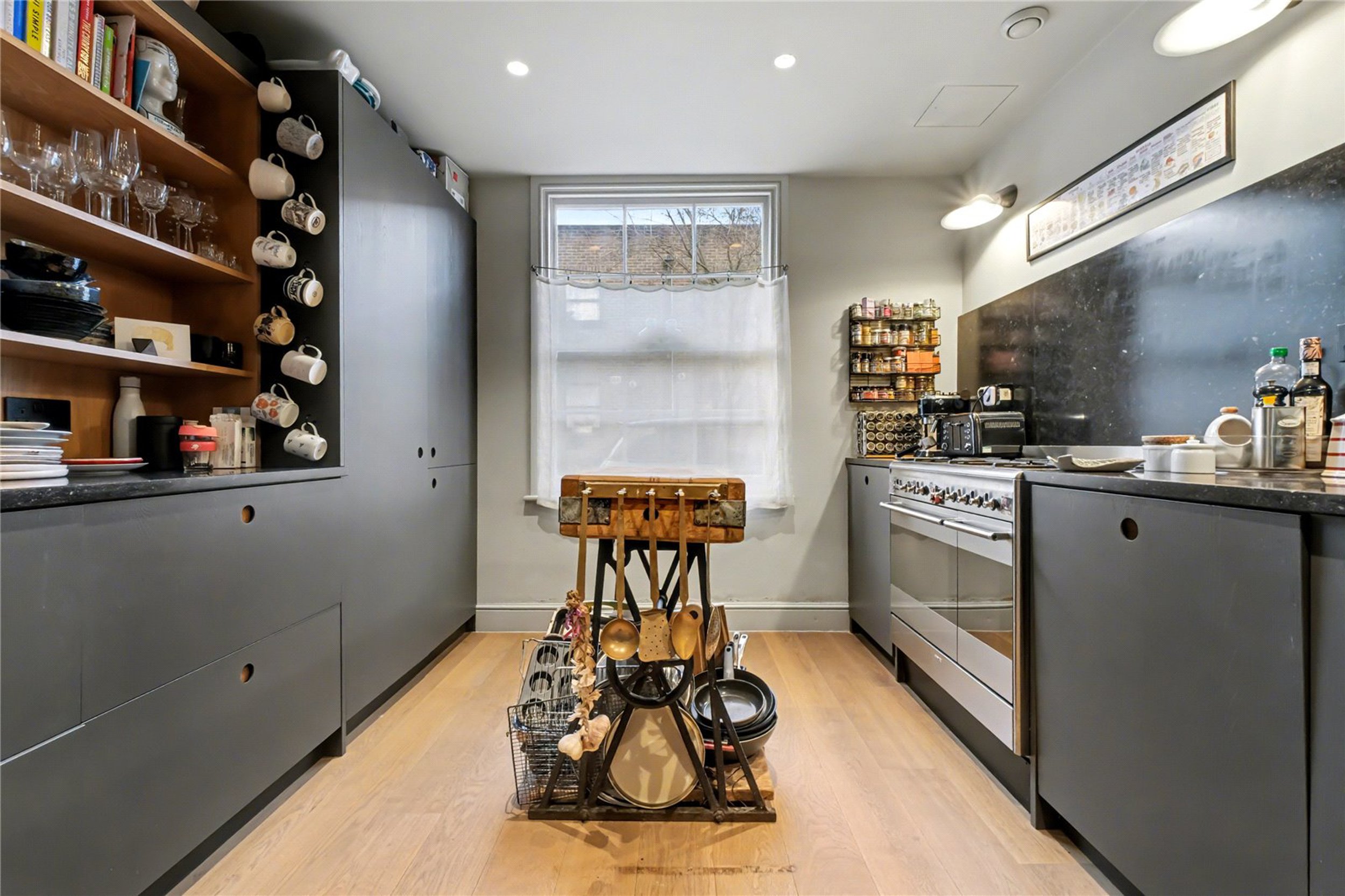 Offering space, light and style, this charming three-bedroom house on Moon Street has been refurbished to a very good standard with a range of tasteful features throughout. The ground floor comprises a bright and spacious open-plan kitchen and living area. The contemporary kitchen includes integrated appliances, and the rear living space benefits from three skylights that fill the room with natural light. A beautifully finished WC is also located on this floor.