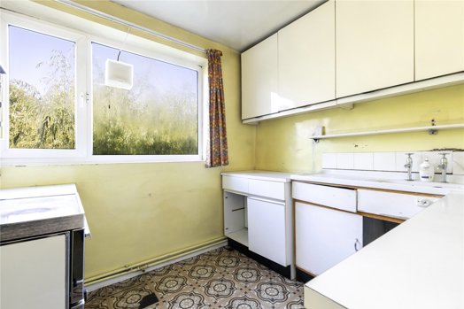 Offering 931 sq ft of internal space, the property includes a share of freehold and benefits from a private integrated garage accessed via a rear driveway. The apartment presents an exciting opportunity for modernisation, with generous proportions and a well-considered layout.
